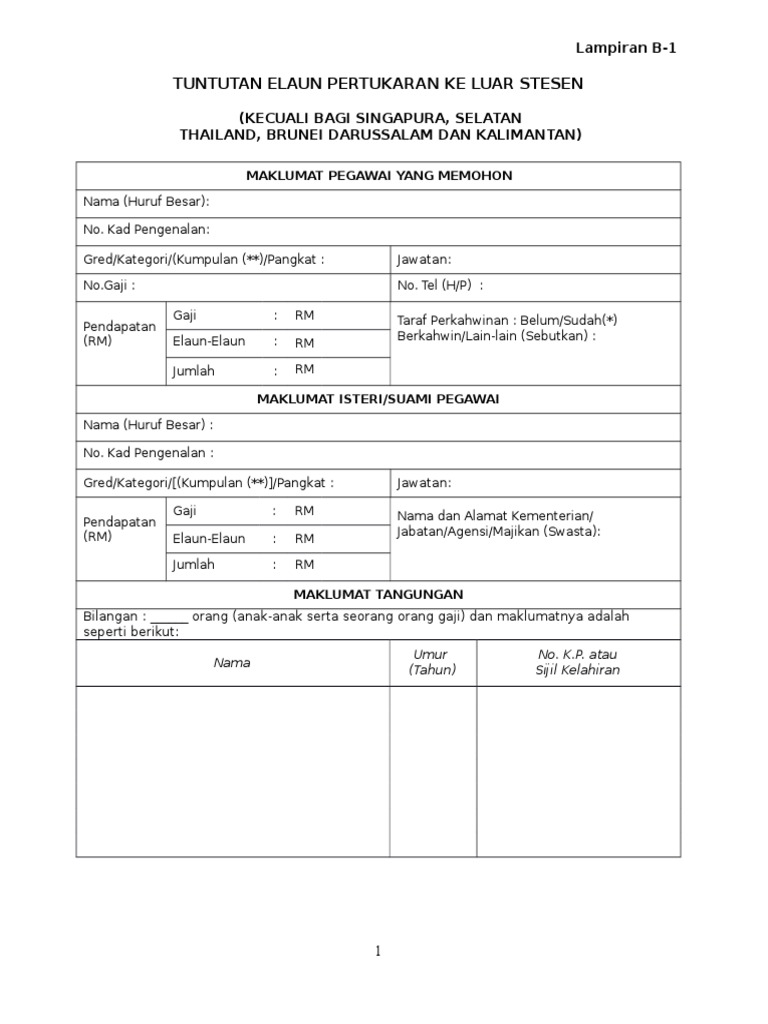 Borang Tuntutan Elaun Pertukaran Ke Luar Stesen Lampiran B 1