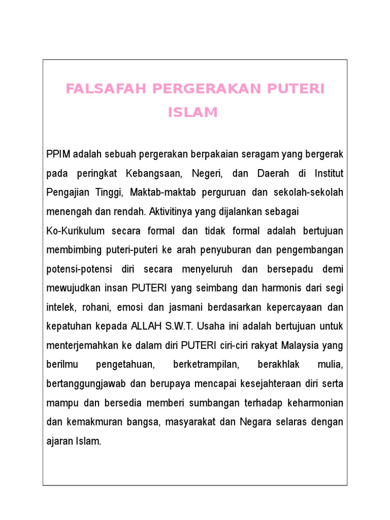 Puteri islam smk kgv 2012 friday 7 september 2012. Buku panduan aktiviti puteri islam unit beruniform merupakan salah satu elemen penting dalam gerak kerja kokurikulum. Catatan dan pengisian buku log diambilkira sebagai penilaian di semua tahap. Ketika itu kurikulum hanya berdasarkan kepada aktiviti keagamaan dan khidmat masyarakat yang bersifat memberi bantuan kepada.