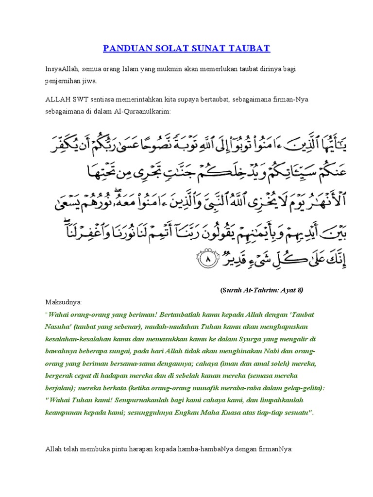 Solat sunat taubat bermaksud solat memohon keampunan dan taubat nasuha daripada allah s w t. Waktu yang paling afdhal dilakukan solat sunat taubat adalah ketika anda bangun untuk melakukan ibadah solat malam kerana pada waktu ini anda akan menjadi lebih dekat dengan allah s w t. Oleh kerana sudah menjadi lumrah manusia untuk melakukan kesilapan dan berbuat dosa maka allah s w t. Niat sholat taubat nasuha bacaan niat sholat taubah nasuha yakni usholli sunnatat taubati rokaataini lillahi ta aala.