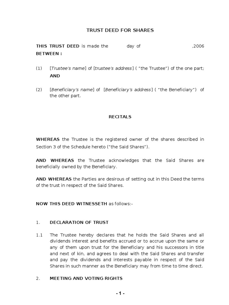 Trust Deed For Shares Trust Law Trustee